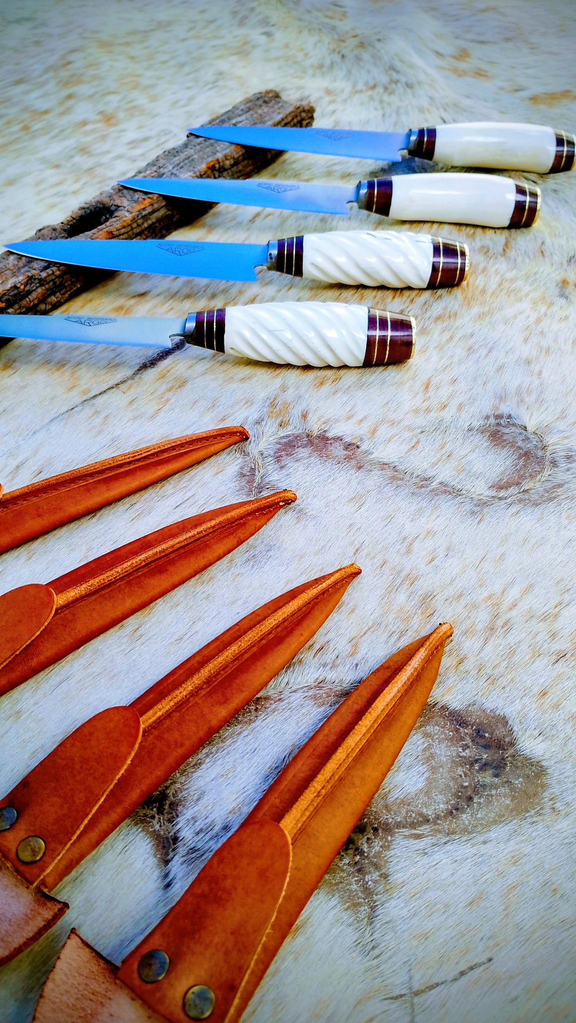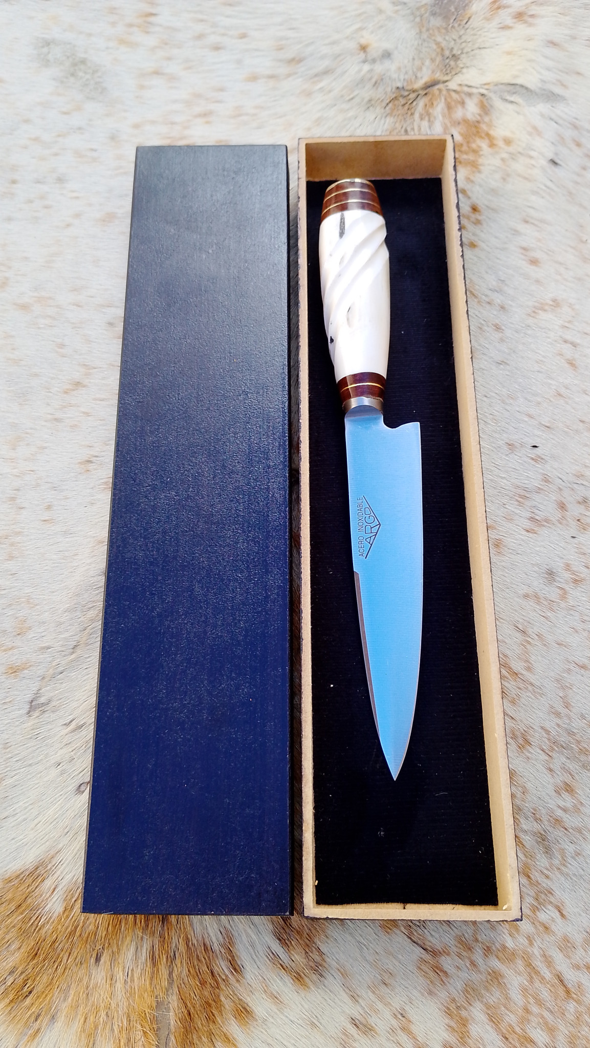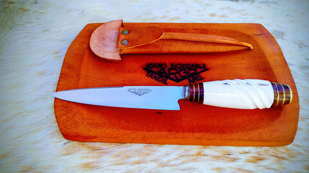 Elaborado en acero inoxidable combinando la tradición criolla y el trabajo artesanal de Tandil. Su mango de hueso de potro trabajado a mano le otorga un carácter exclusivo y único. Se acompaña de vaina confeccionada en cuero vacuno para que lo puedas transportar a eventos y asados.