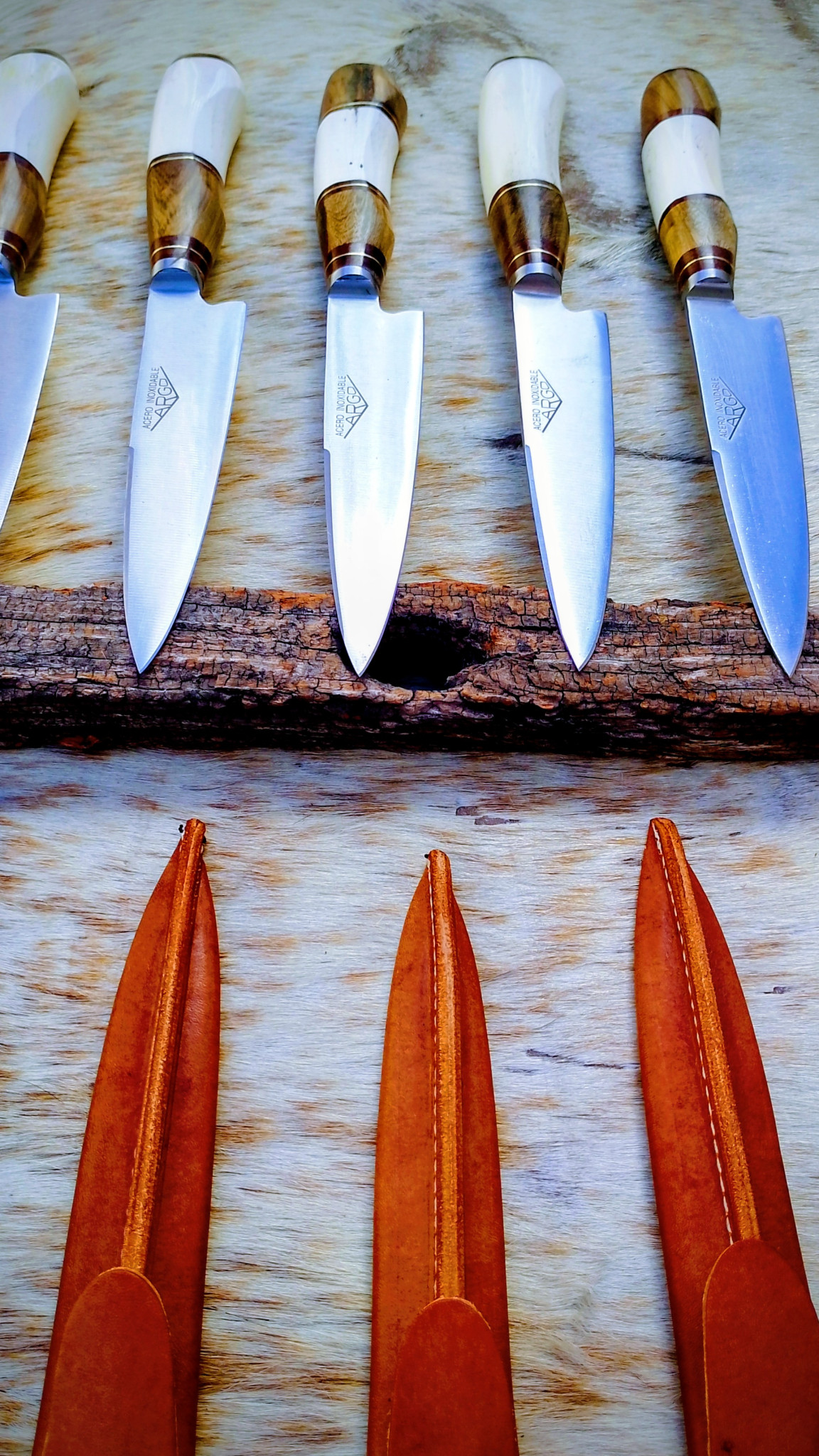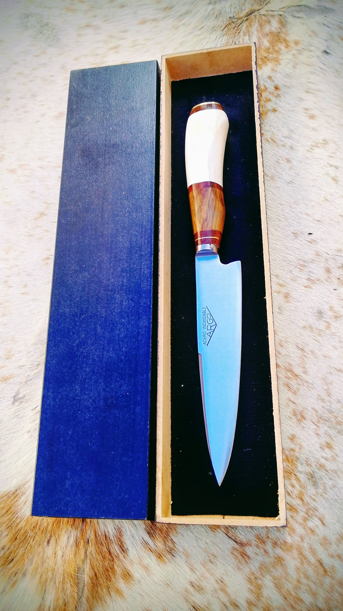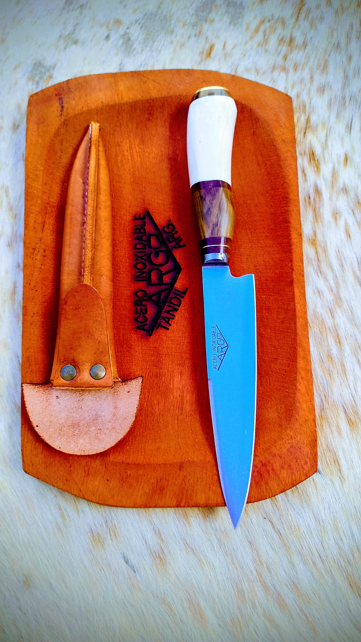 Cuchillo ARGO encabado en madera y hueso de potro/vaca con detalles y terminaciones en bronce. Vaina en cuero vaqueta.