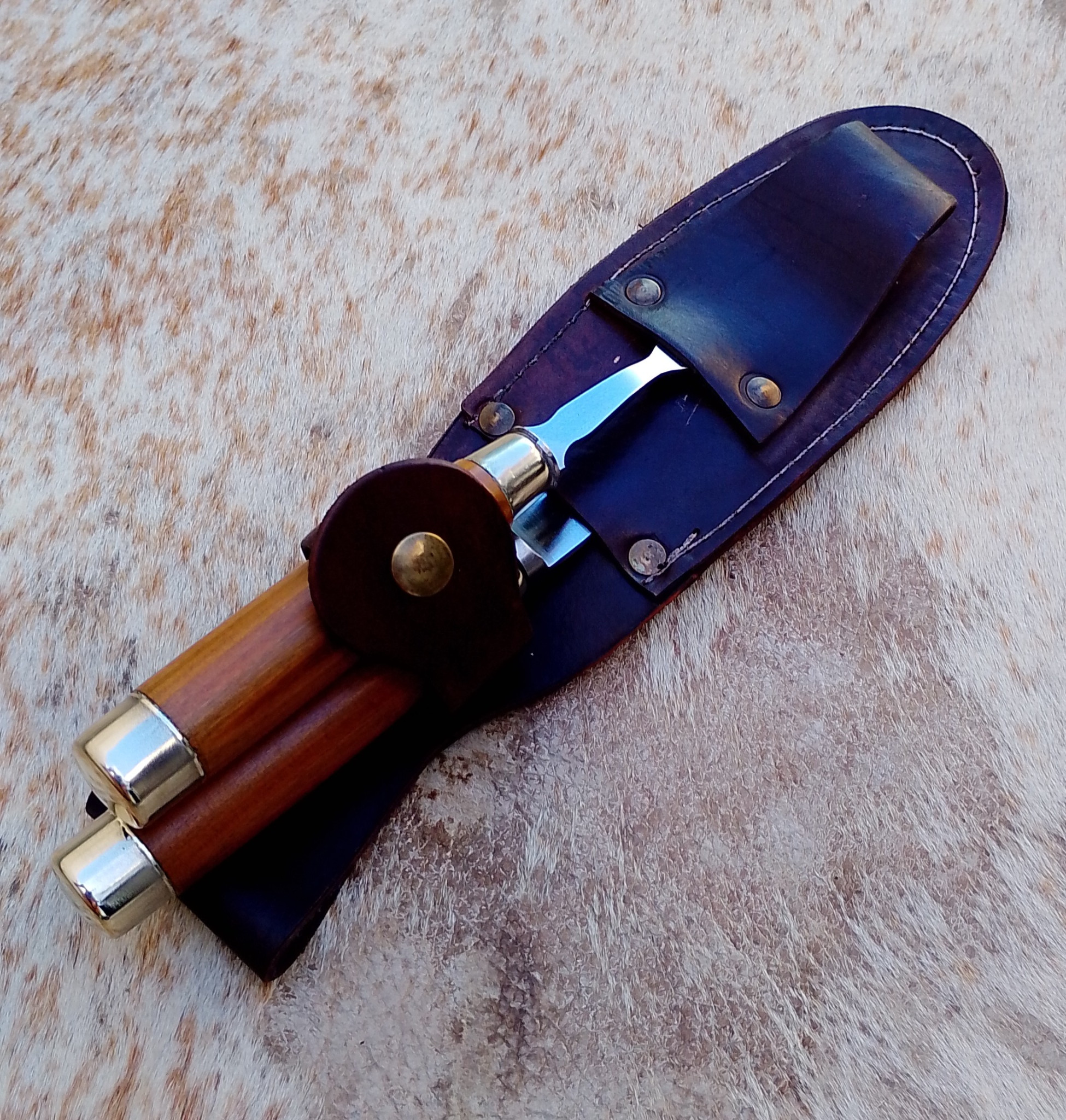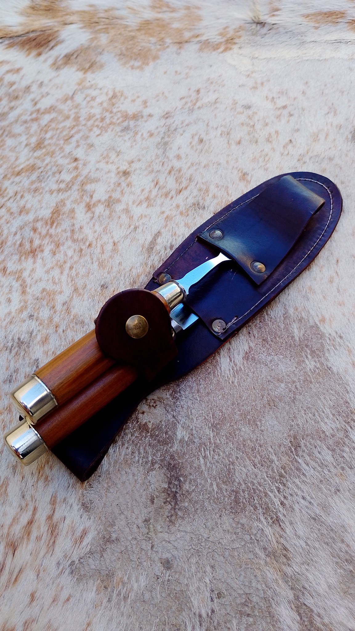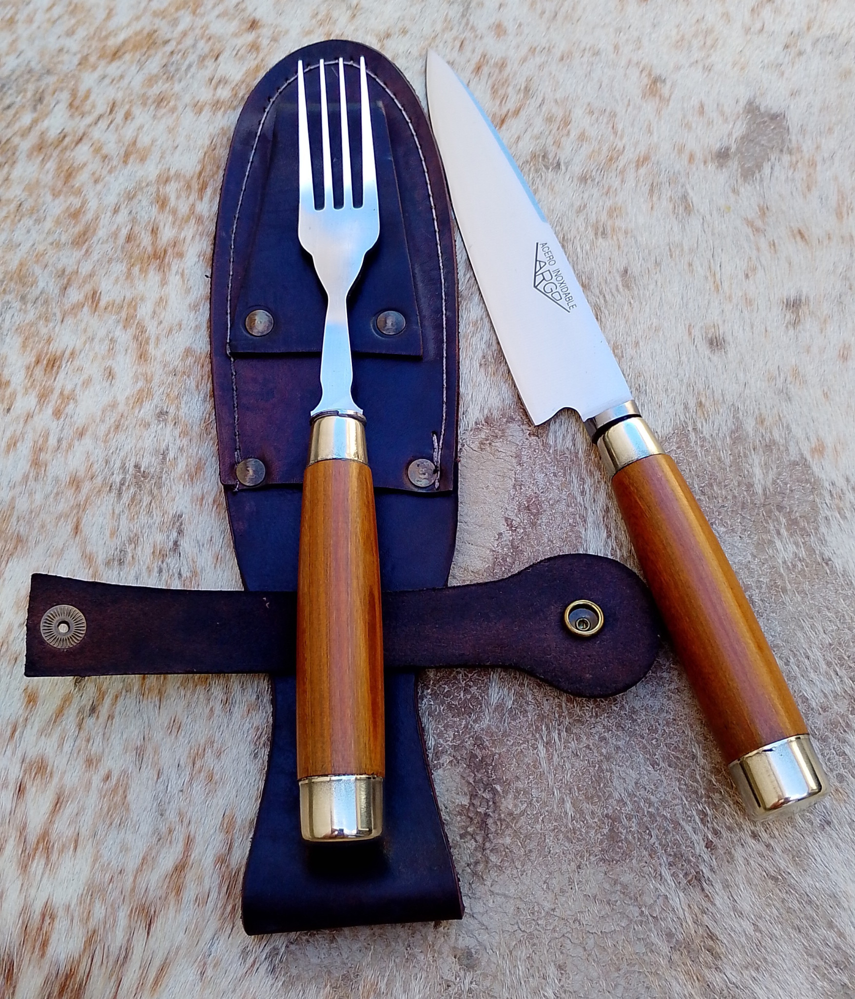 El cuchillo presenta hoja de acero inoxidable, mientras que ambas piezas cuentan con mangos de maderas seleccionadas y terminaciones en alpaca, logrando una combinación refinada de materiales nobles y detalles artesanales.