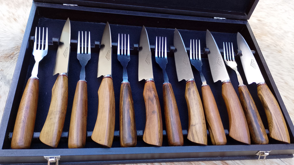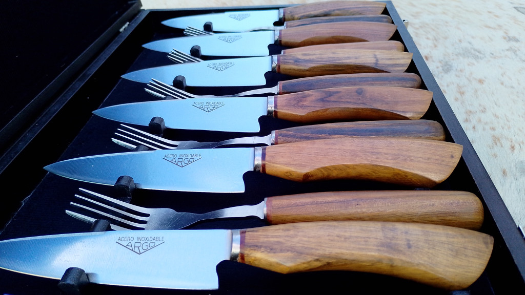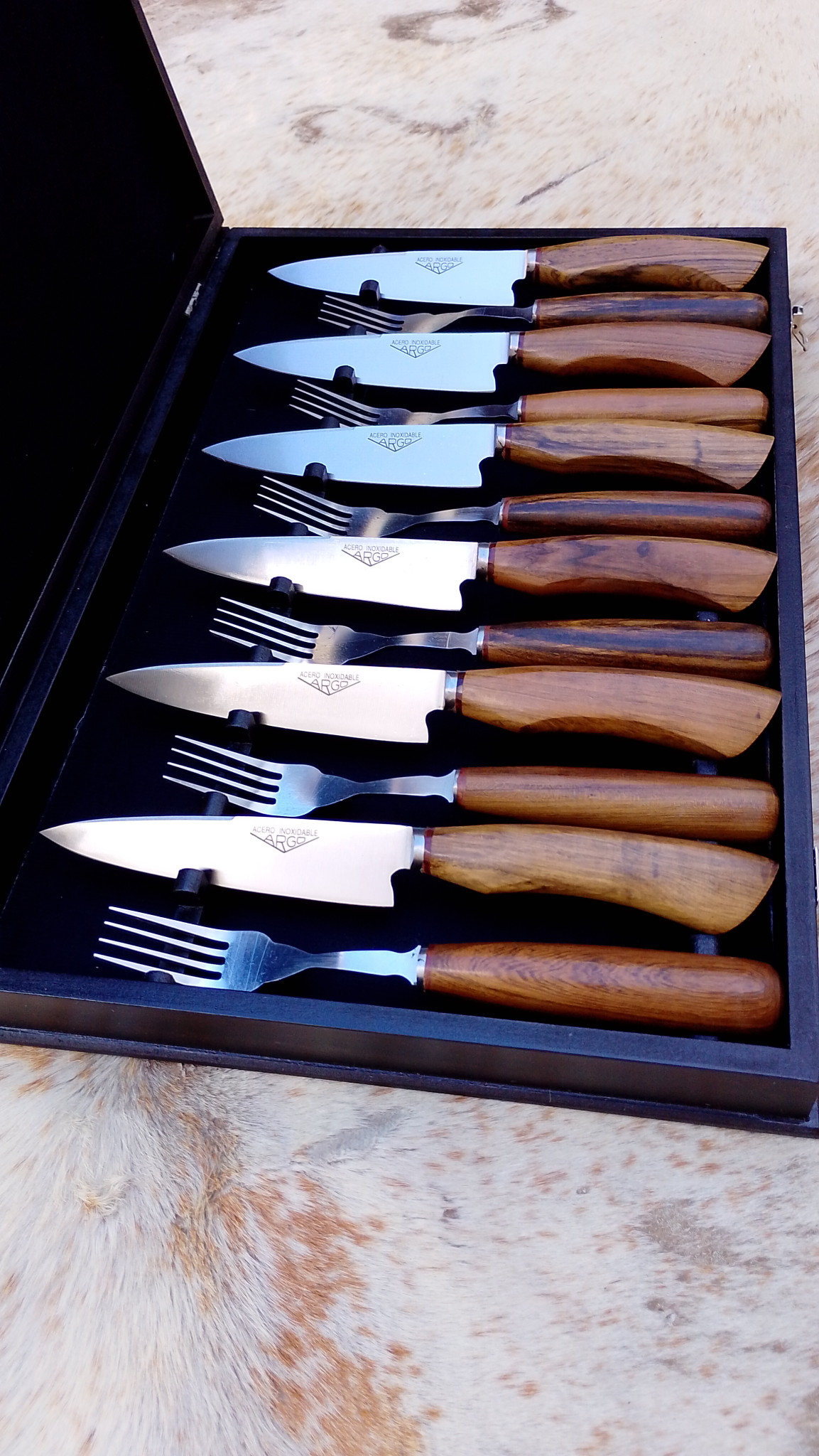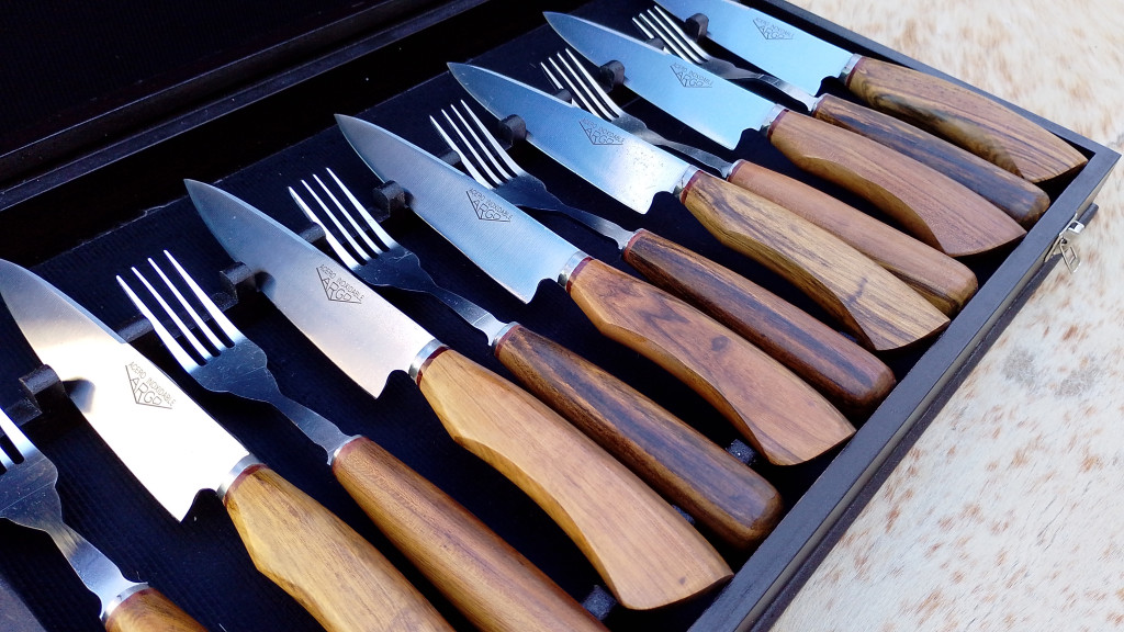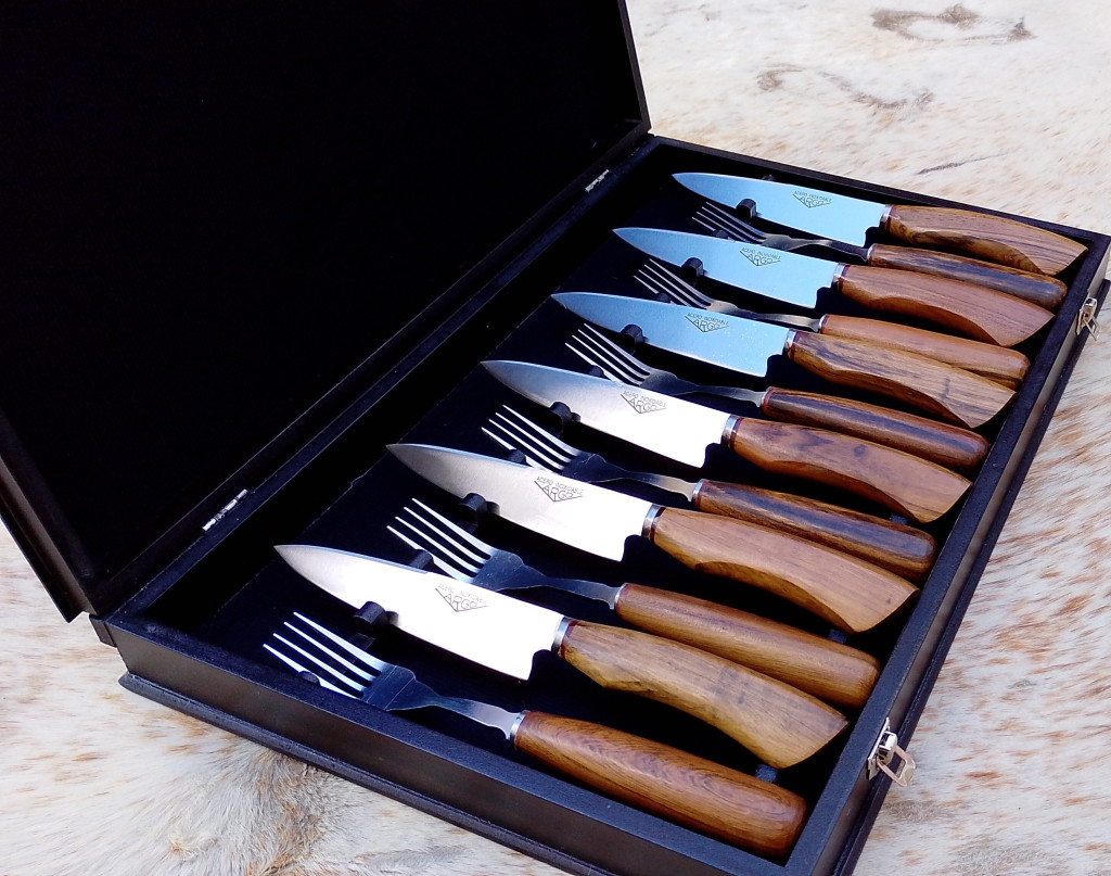 Los cuchillos cuentan con hojas de acero inoxidable, que ofrecen un corte eficiente y durabilidad en el uso diario. Tanto cuchillos como tenedores presentan mangos de maderas duras, seleccionadas por su resistencia y su belleza natural. La terminación en ángulo en la culata del mango aporta un detalle distintivo que combina comodidad, firmeza en el agarre y una estética moderna.