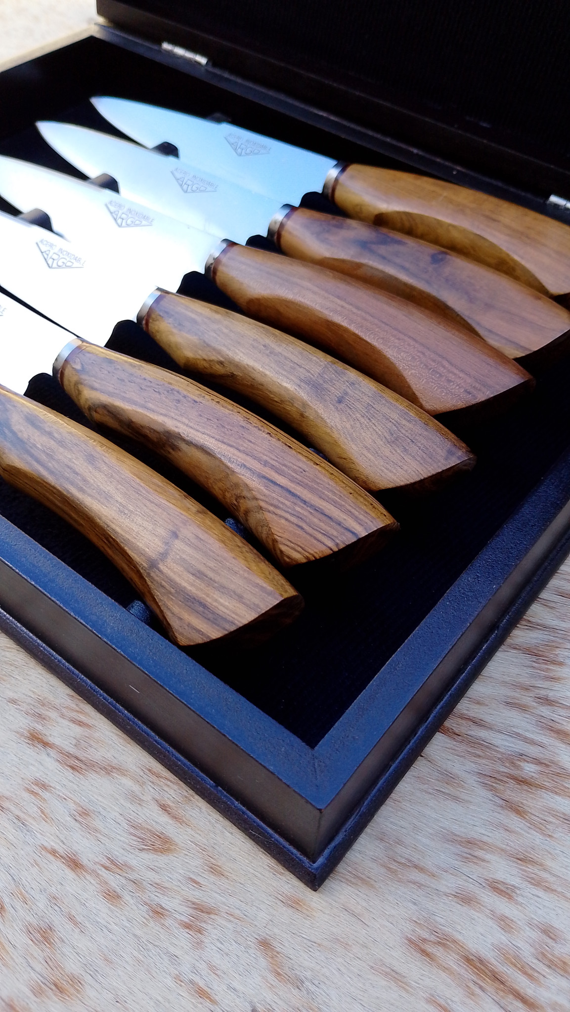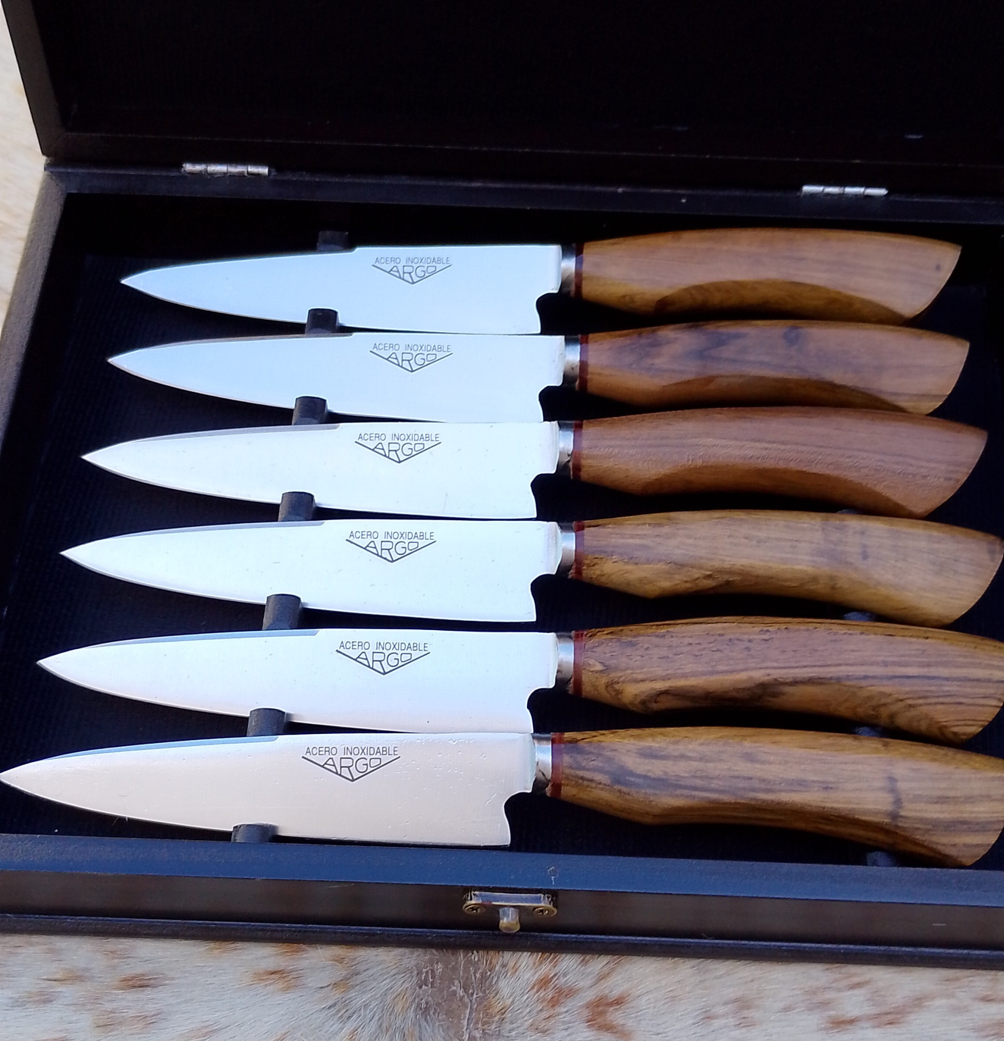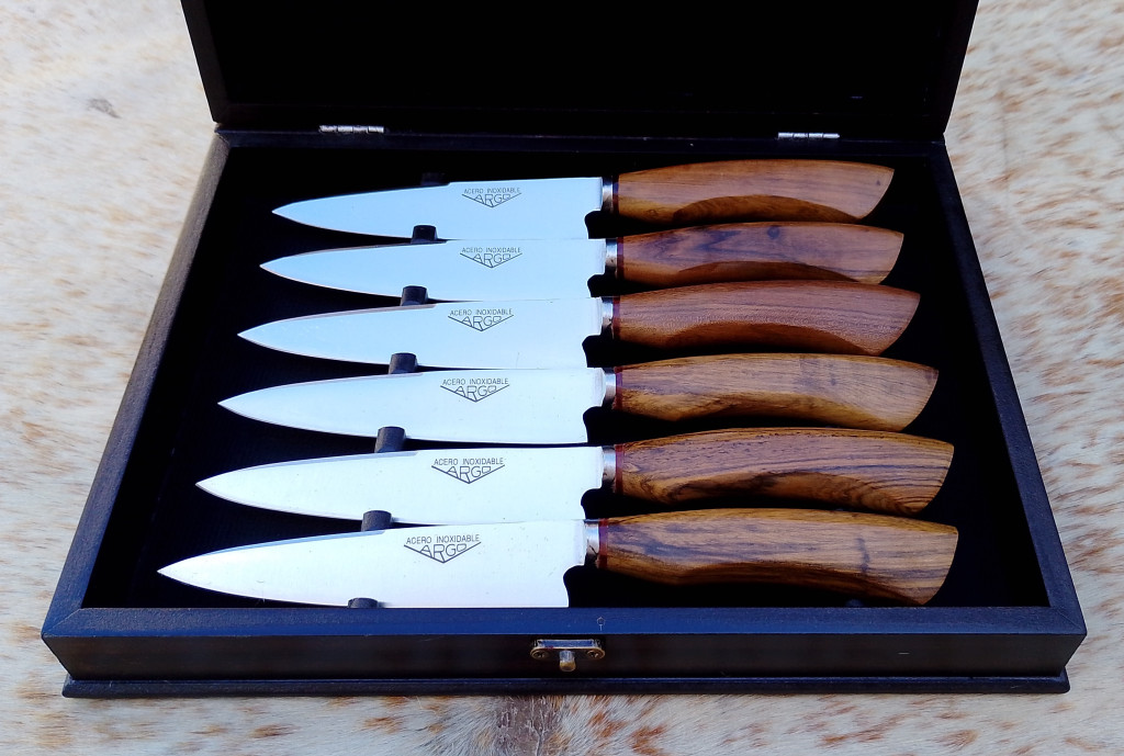 Set de 6 cuchillos de la línea Argo Básico, con hojas de 14 cm de acero inoxidable que ofrecen un corte preciso y gran durabilidad. Sus mangos de maderas duras, con terminación en ángulo, brindan un agarre cómodo y firme, combinando funcionalidad y estilo natural. Presentados en una elegante caja, ideal para la mesa diaria o para regalar.