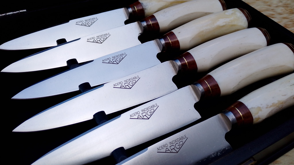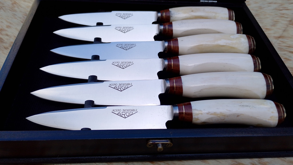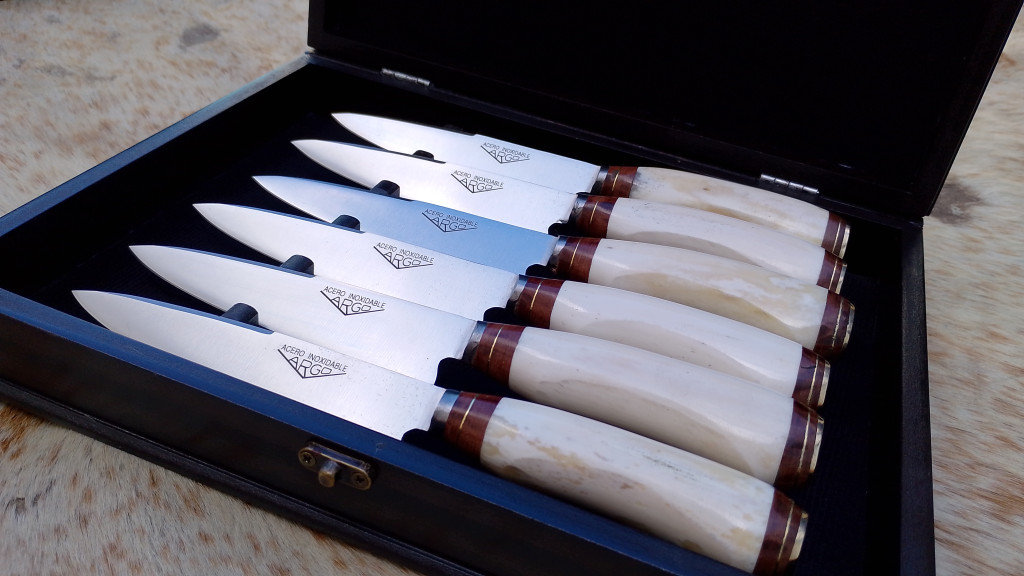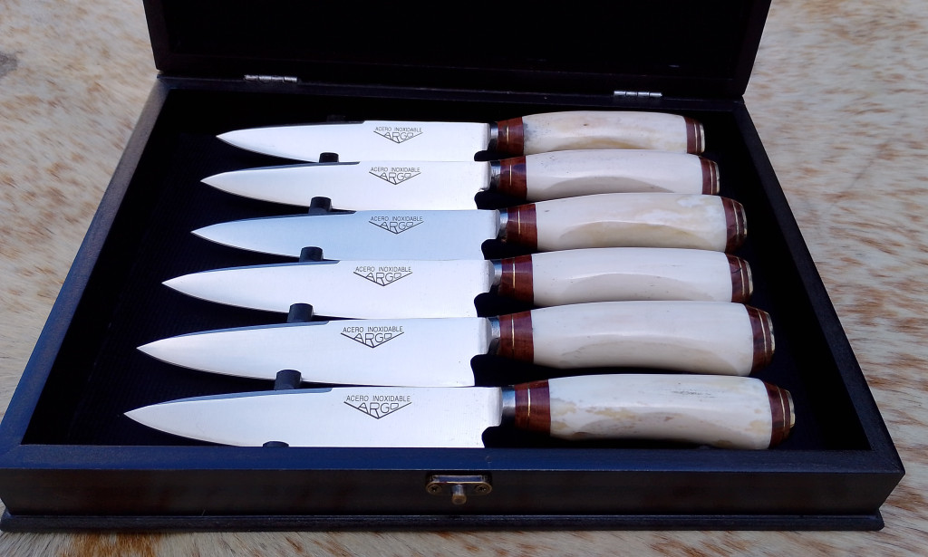 Set de 6 cuchillos de la línea Argo Potro, con hojas de 14 cm de acero inoxidable que garantizan un corte preciso y duradero. Sus mangos de potro en tono marfil aportan una estética distintiva y tradicional, realzada por elegantes terminaciones en bronce que destacan su carácter artesanal. Presentado en una elegante caja, ideal para la mesa o para un regalo especial.